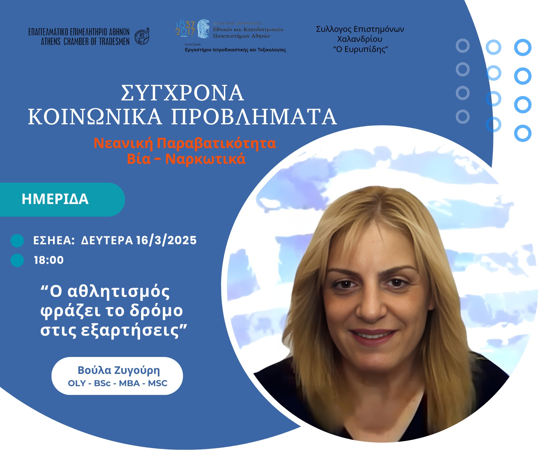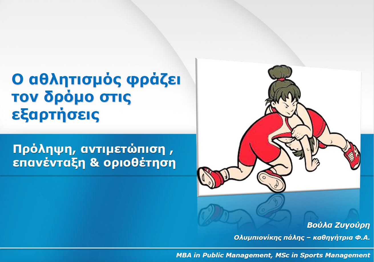 Μεταξύ των ομιλητών της ημερίδας η Ολυμπιονίκης Βούλα Ζυγούρη η οποία θα παρουσιάσει το θέμα: “Ο αθλητισμός δράζει το δρόμο στις εξαρτήσεις – Πρόληψη, αντιμετώπιση , επανένταξη & οριοθέτηση” όπου θα αναλύσει τον τρόπο με τον οποίο η άθληση ασκεί θετική επίδραση στην πρόληψη και την καταπολέμηση των εξαρτήσεων.