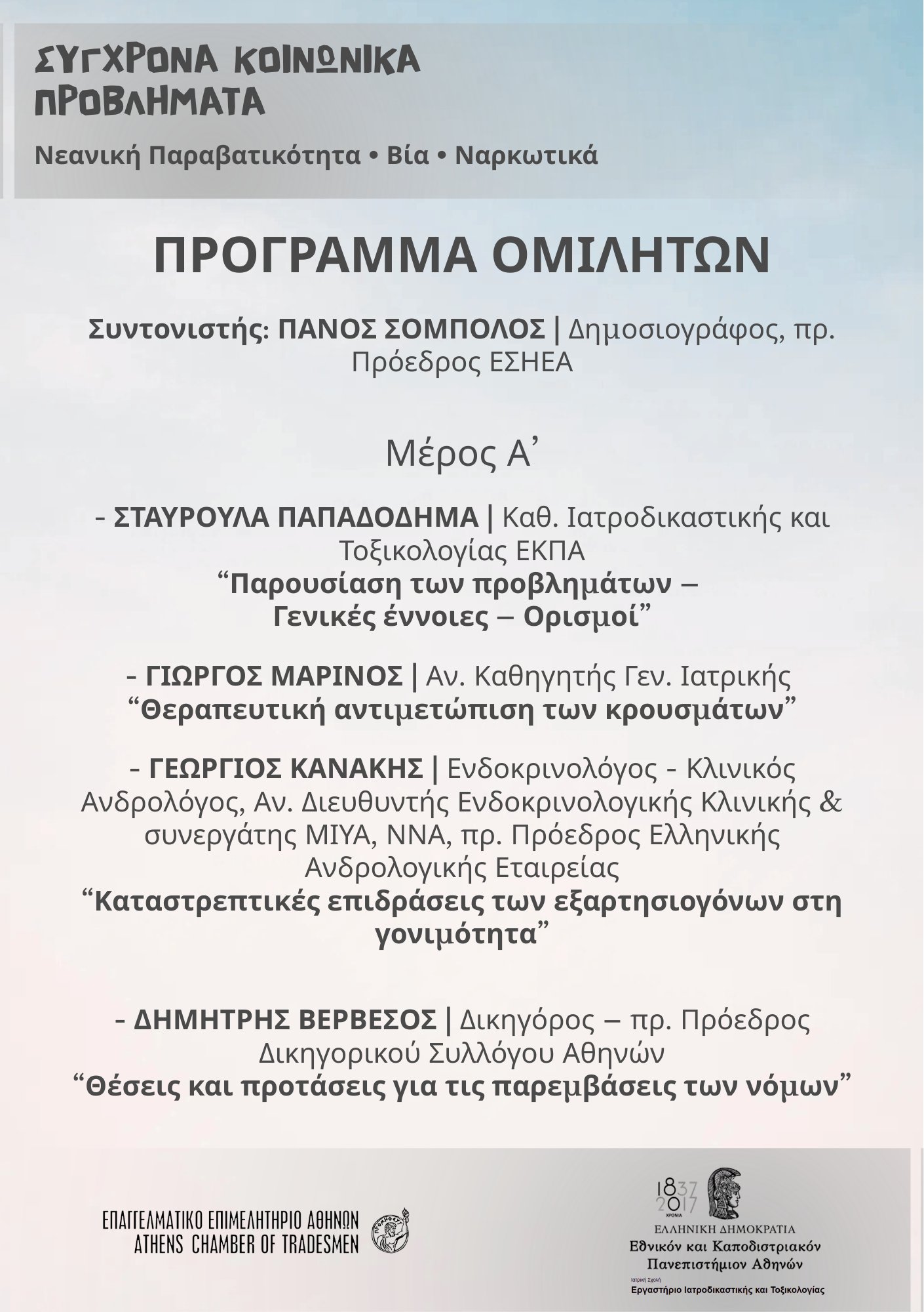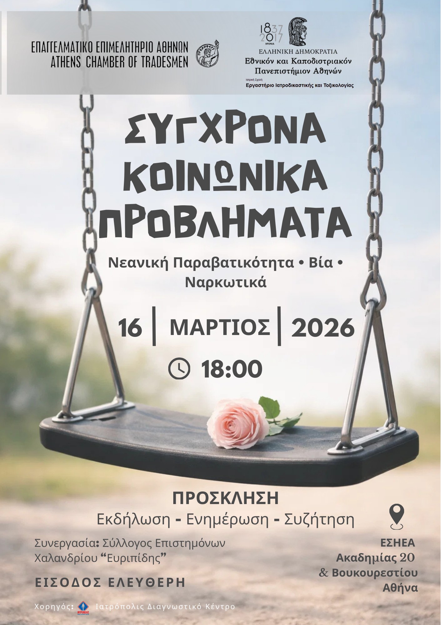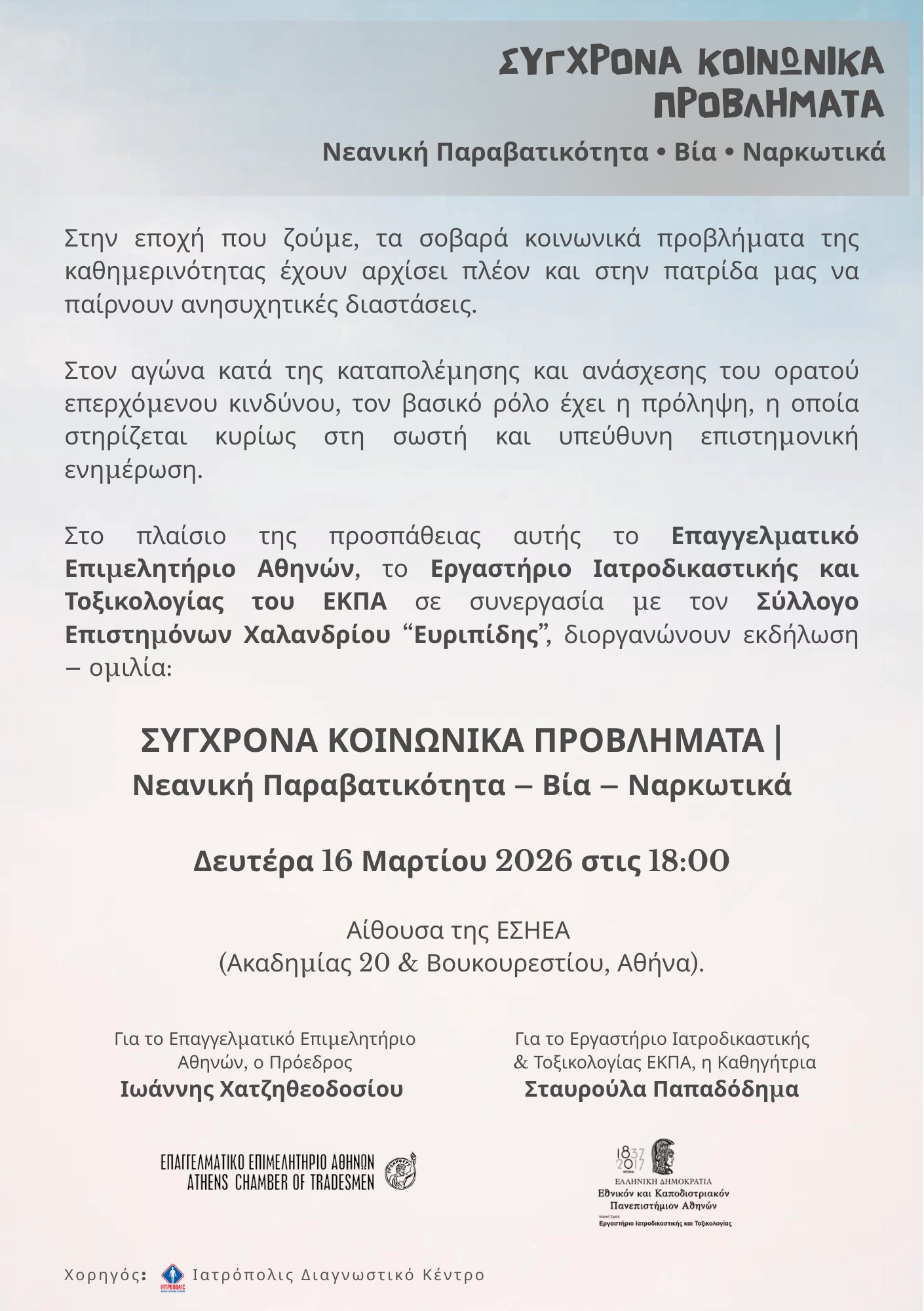 Το Επαγγελματικό Επιμελητήριο Αθηνών και το Εργαστήριο Ιατροδικαστικής και Τοξικολογίας του ΕΚΠΑ σε συνεργασία με τον Σύλλογο Επιστημόνων Χαλανδρίου “Ο Ευρυπίδης”, στο πλαίσιο της συμβολής του στον δημόσιο διάλογο για σημαντικά κοινωνικά ζητήματα που επηρεάζουν την καθημερινότητα των πολιτών, συνδιοργανώνουν ενημερωτική εκδήλωση με θέμα: